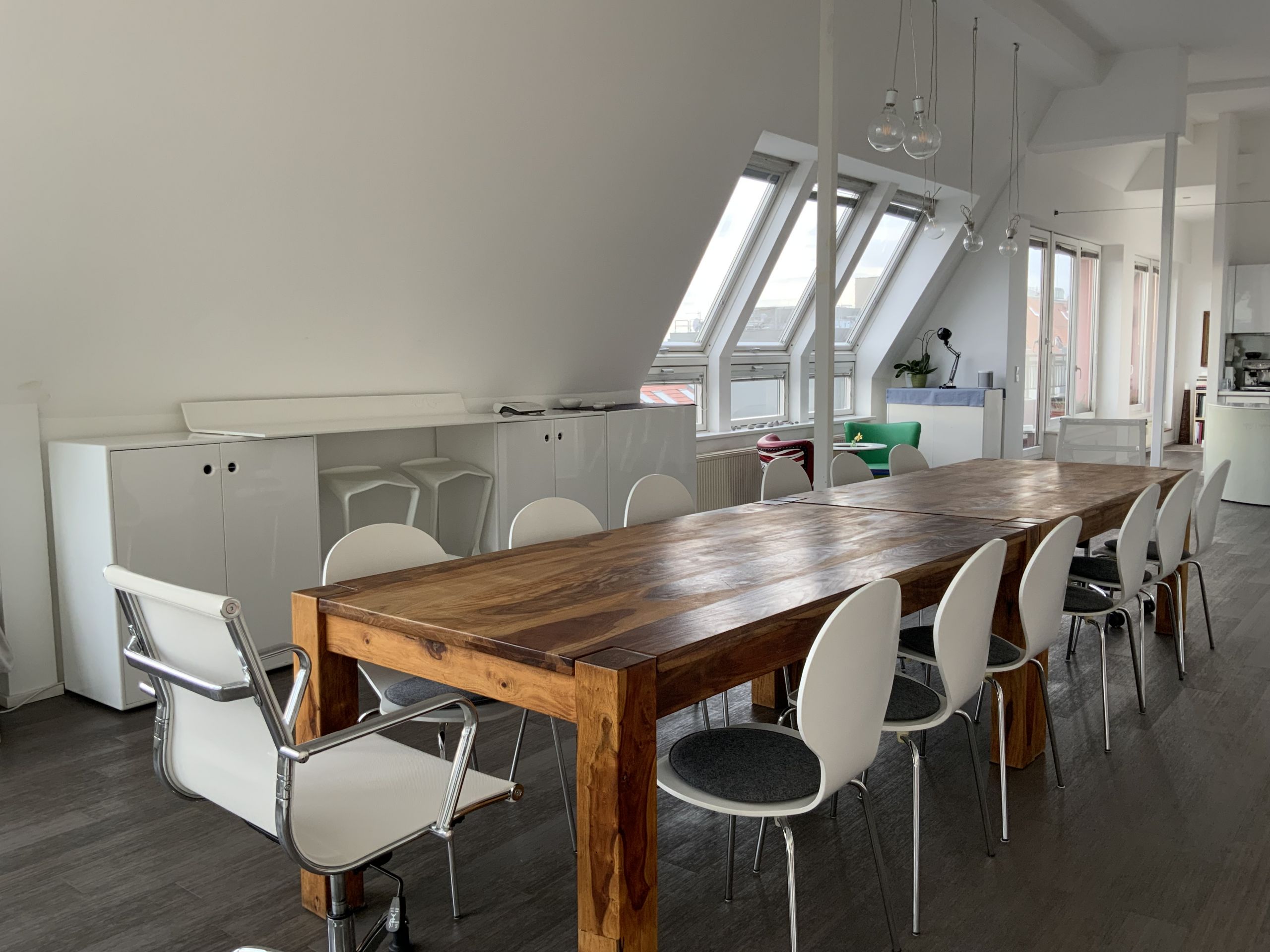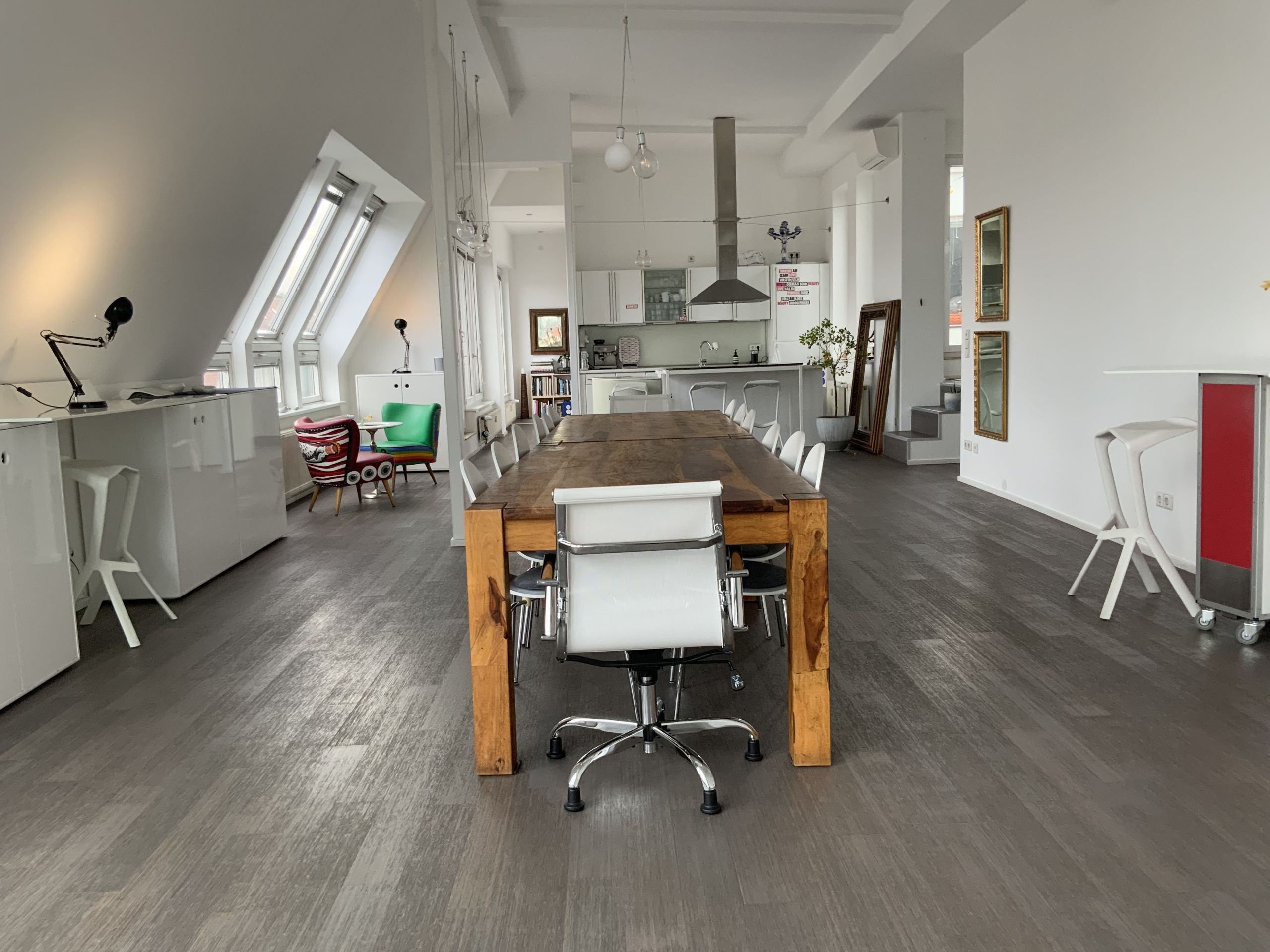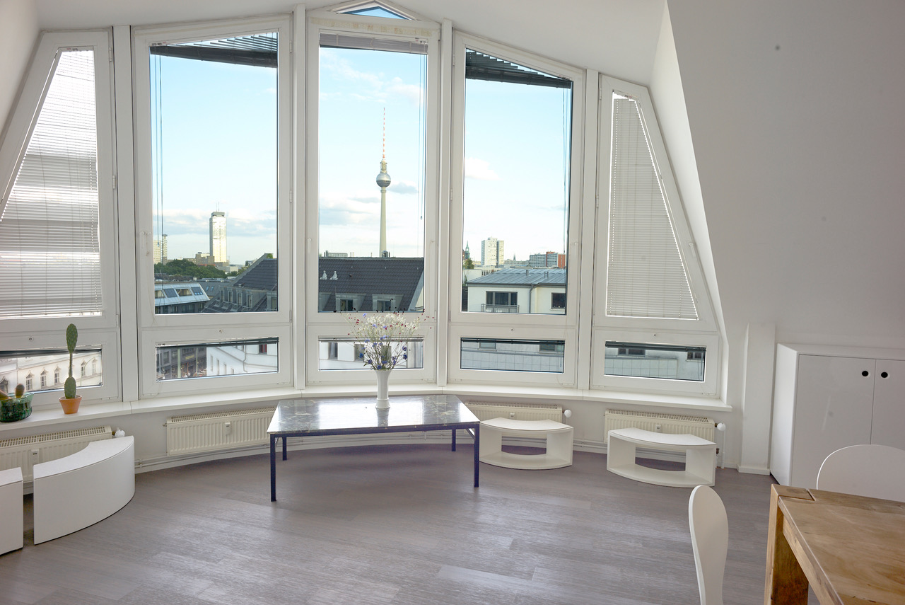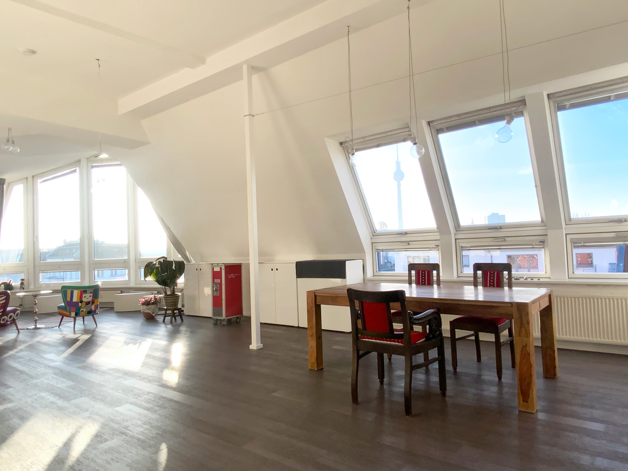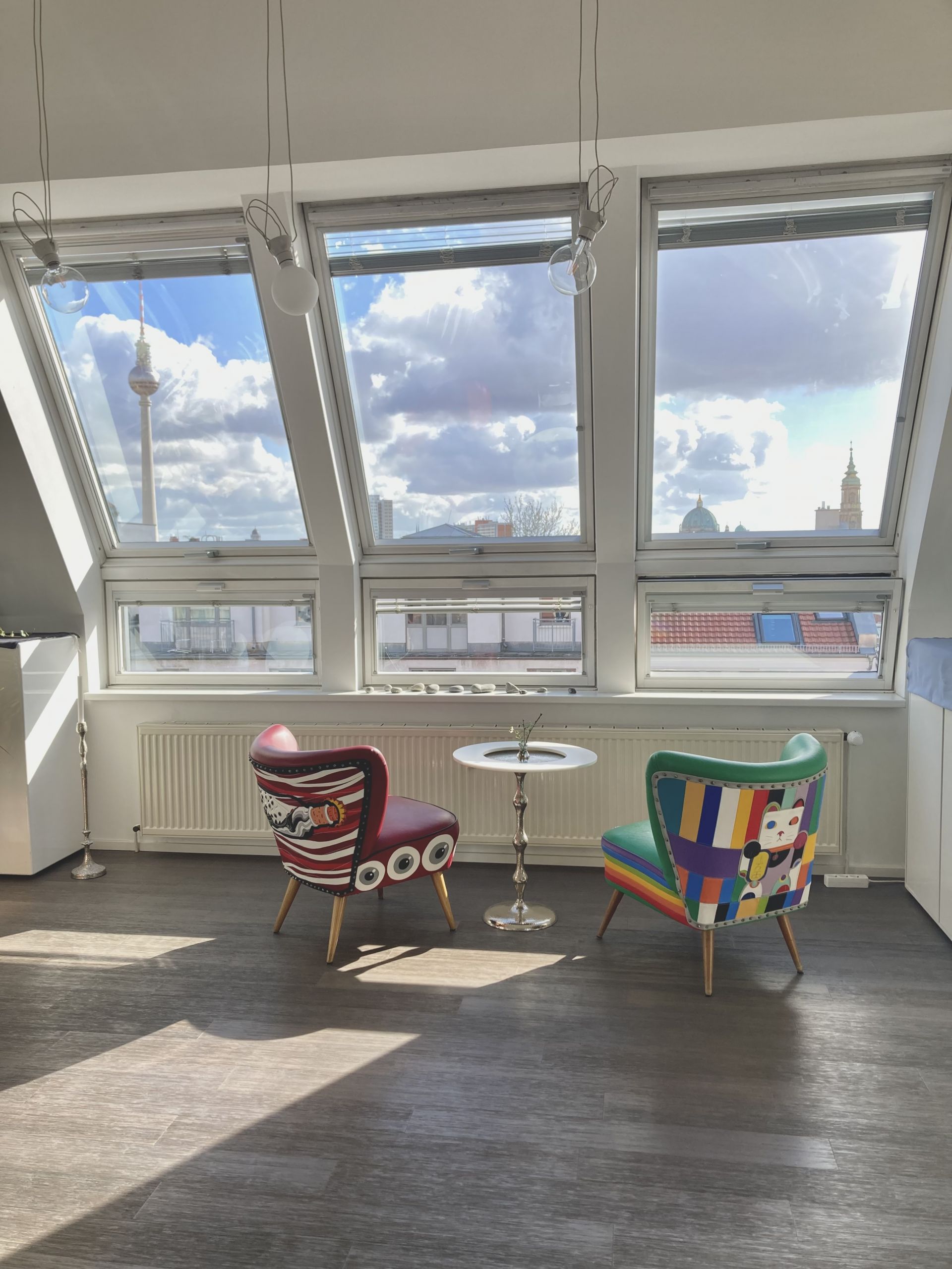 Discover USLU TOWER: Your premier venue in Berlin Mitte. This exclusive airy penthouse loft at Rosenthaler Platz offers a modern and unique setting for workshops, meetings, and unforgettable events with an amazing skyline view, including the iconic TV tower.